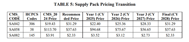 In the proposed rule, 18 codes related to supply packs were identified as incorrect. Upon review, CMS reported in the final rule that 15 of the supply packs referenced are included in the direct PE inputs for over 100 codes. For this reason, they are not finalizing a pricing update at this time. For the 3 remaining codes, CMS finalized a -year price transition to occur between 2025 and 2028. The chart below shows the finalized changes and schedule.